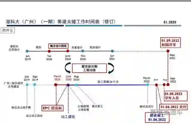 港科大与广州市南沙区政府将共同负责港科大(广州)校园的规划和建设工作,其中,校园整体设计过程由港科大主导,预计校园规划初步方案在2020年上半年完成,整体施工及交付过程由广州市南沙区政府主导执行,计划 2021 年至 2022 年 6 月陆续完工。2022 年 9 月正式招生。