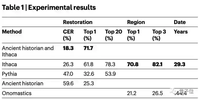 研究人员分别将Ithaca与历史学家、同类AI方法Pythia、以及Ithaca与历史学家合作等不同破解古文字的方法做了对比。