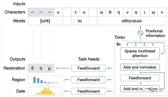 其输入随后被传递给三个分别负责文字修复、地理归属、时间归属的任务头,每个头都由一个前馈的神经网络组成,专门负责各自任务的训练。