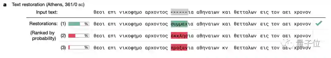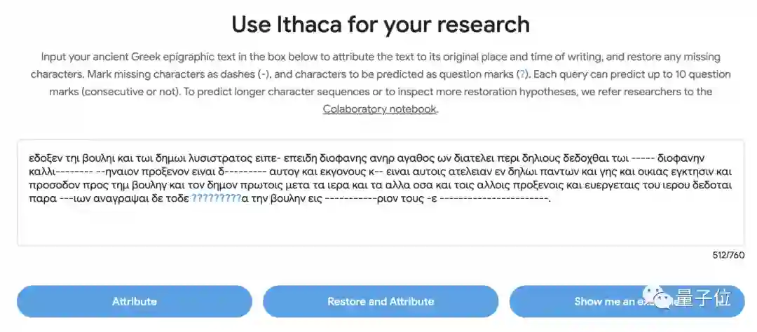 Ithaca现在提供了在线试用的途径,登录官网,在方框中中输入古希腊铭文,将缺少的字符标记为破折号(-)),将预测的字符标记为问号(?)。