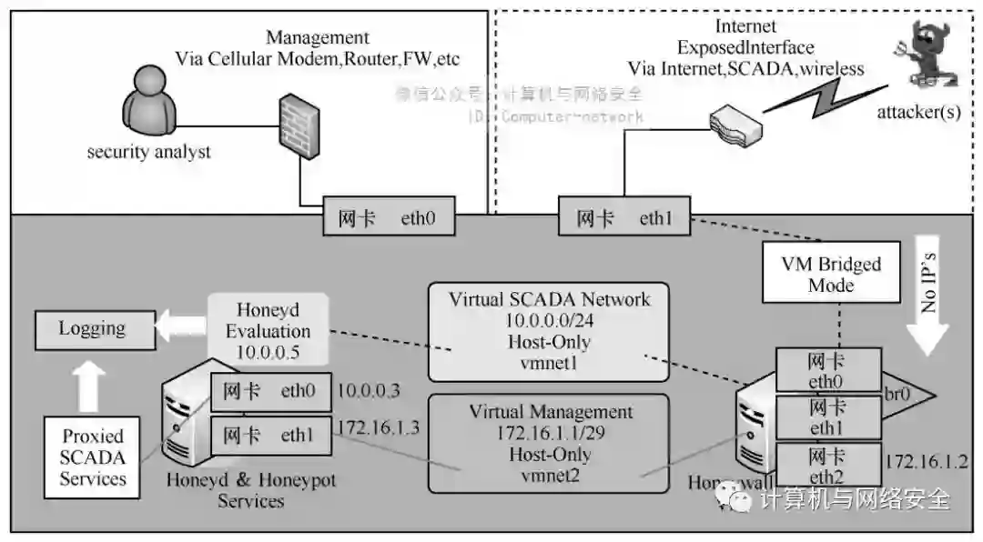 由于在蜜罐构建中,许多资产所有者希望可以用他们自己的现场设备替换模拟PLC。因此,Digital Bond在SCADA Honeynet的基础上,推出了修改版本SCADA Honeywall,它可以允许一个真实的PLC或者其他的控制系统组件替换图3中的模拟PLC。