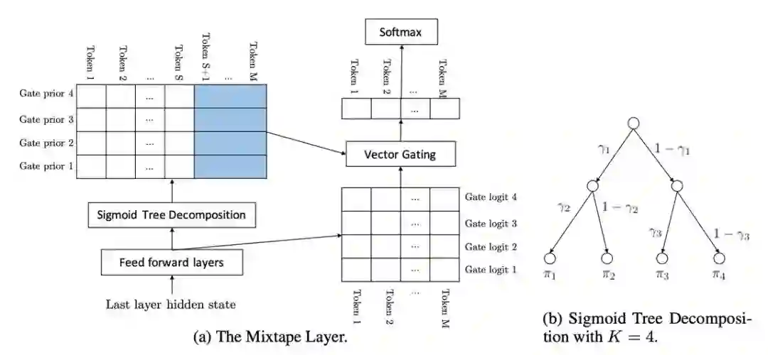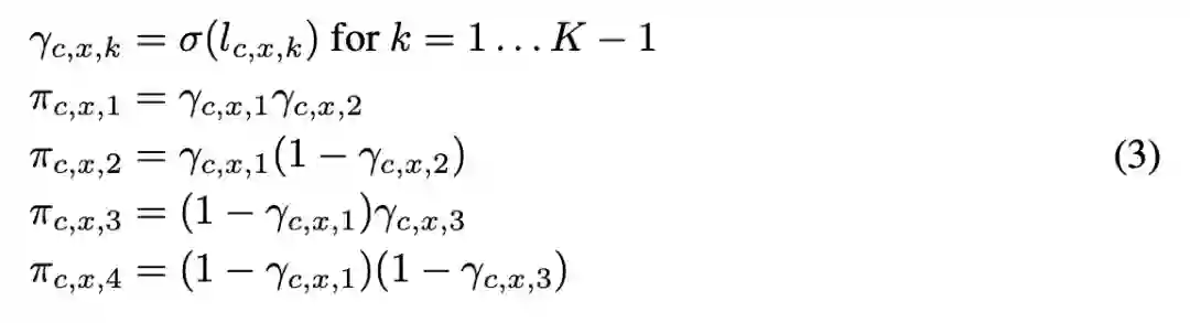 使用 sigmoid 树分解,计算公式 (3) 中的门控先验 π_c,x,k;