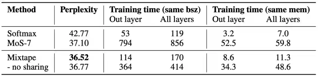 研究者对比了 Mixtape、MoS 和 softmax 的困惑度、翻译质量、速度和内存约束,证明 Mixtape 能够在效果和效率之间做好权衡;