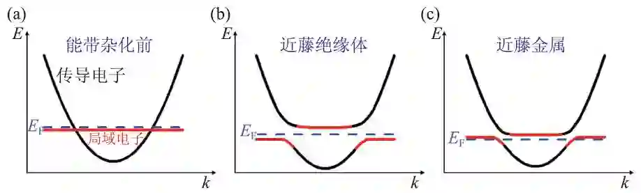 图1 传导电子与局域电子(a),在低温下杂化形成近藤绝缘体(b)或者近藤金属(c)