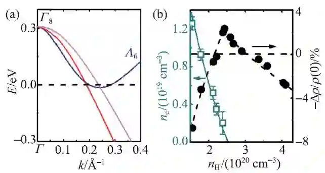 图2 YbPtBi 的高温拓扑性质[21] (a)沿着ΓL 方向的能带结构示意图;(b)载流子浓度与径向负磁阻之间的关系