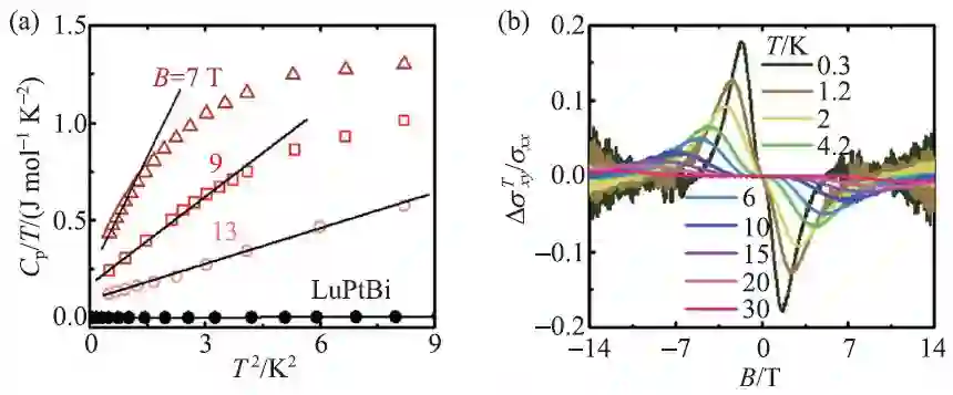 随着温度的下降,局域的f 电子与巡游电子杂化增强,形成有效质量很重的复合费米子,导致其费米速度迅速下降。与之相应,手性反常效应对径向磁阻的贡献迅速减少,在20 K以下可以忽略。由于近藤温度较低,目前的角分辨光电子能谱的能量分辨率还不足以揭示重费米子态中的能带拓扑结构。另一方面,重费米子体系的电子比热系数很大,有利于精密测量比热随温度的变化。通过低温比热测量,我们发现电子比热系数正比于温度的二次方(图3(a)),与具有线性色散关系的外尔点一致。此外,还在30 K以下观察到了明显的拓扑霍尔效应(图3(b)),进一步表明非平庸拓扑态的存在。