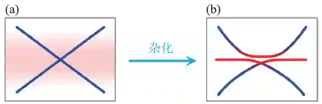图4 外尔费米子随杂化强度演化的示意图(a)当局域电子(红色)与传导电子(蓝色)杂化较弱时,传导电子能带中存在外尔点;(b)随着杂化强度的增强,能带发生重整化,电子有效质量增加,外尔点仍然保留,但杂化后形成的准粒子的费米速度急剧减少