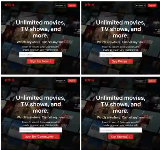 Netflix 特别喜欢 A/B 测试。上图所示,为公司主页欢迎词的四版测试稿