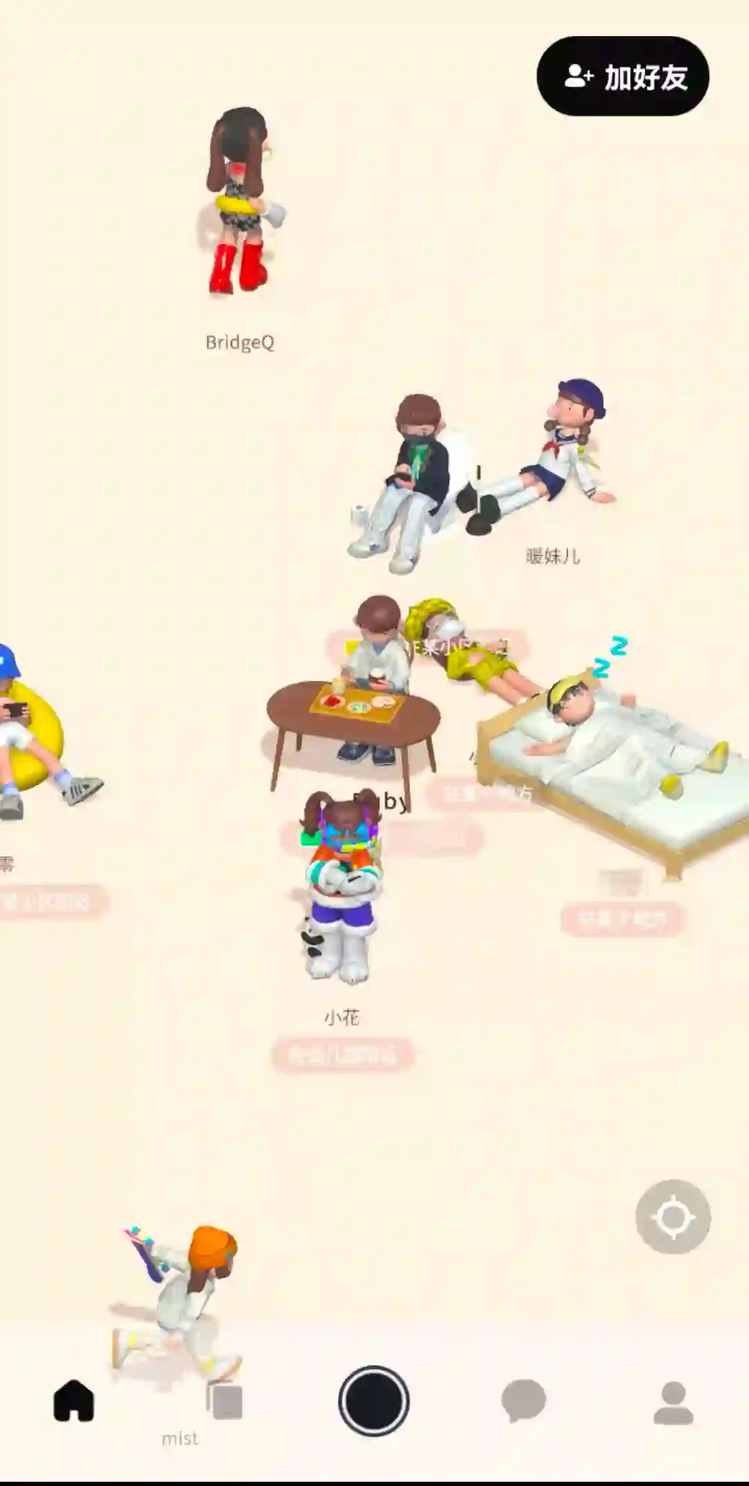 刚进入啫喱的他们新鲜感十足,赴约之前,就开始在啫喱上互相同步动态和计划,也会根据实际情况更换自己的动态,睡觉、刷剧、打游戏、搬砖,一看虚拟形象,就能看到每个人在做什么。