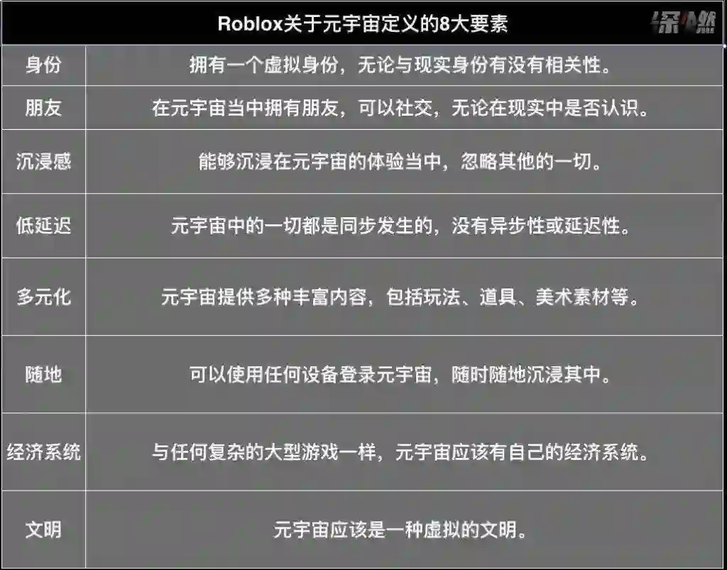 “元宇宙第一股”Roblox定义的元宇宙概念中,需要具备8个关键特征,分别为身份、社交、沉浸式体验、低延迟通信、多元化、随地、经济系统以及文明。