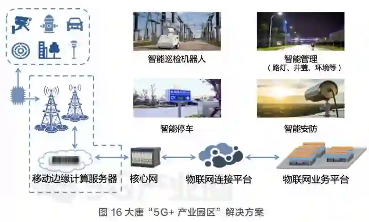 大唐“5G+ 产业园区”解决方案由物联网终端感知层、网络传输层、数据计算层和应用平台层构成。
