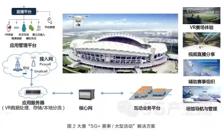 面向有 5G 站址资源的赛事 / 大型活动的场馆,对接场馆内的业务平台,利用 5G 网络的大带宽、移动边缘计算(MEC)、网络切片和人工智能等技术,开发应用内容的呈现和管理平台,提供 VR 赛场体验、视频直播分享等业务,使观众以第一视角“身临其境”,感受赛场魅力。