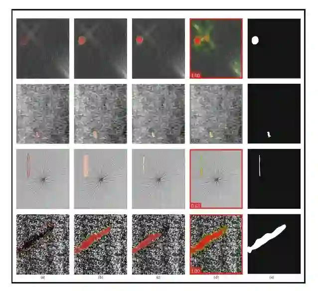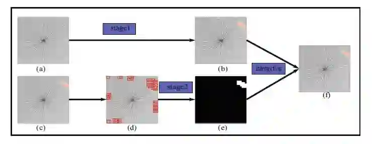 图6 阶段1与阶段2的融合。(a)为需检测的原始图像,(b)为阶段1粗略分割的结果,该结果也作为阶段2的初始化(标为(c)),(d)为对阶段1的ROIs切割得到的区块。(e)为阶段2的检测结果,每个区块都被分类成缺陷区块或是得缺陷区块。(f)为阶段1和阶段2的交集,也是最终的检测结果。