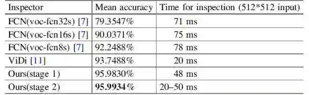 本文使用[7]中的平均准确性来评估本文系统的性能。真值是通过手工标注获得并用于训练本文的模型。该方法是一种合理的方法,因为其对缺陷检测训练了一种类人的模型。本文希望该框架可以给出和人工检测结果一样的检测结果。所以,本文也是用手工标注真值来评估算法性能。