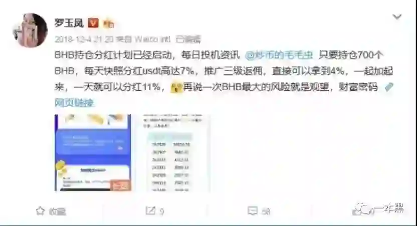 2018年12月4日,凤姐在微博上发布了一条区块链广告,平台叫BHB,用户只要持有700枚BHB发行的数字货币,就可以获得平台分红,最高1天可分红11%。交易需在平台指定的交易所进行,但扫描二维码时发现平台已关闭,原因是没有许可证件或牌照。
