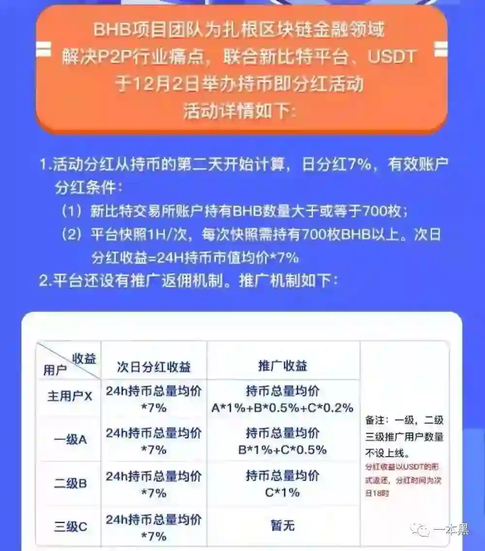 BHB分红有两种方式,一种是平台分红,一种是推广返佣。分红的前提是至少拥有700枚代币,代币可以流转,也可以提现。每人每天提现的上限为50枚。