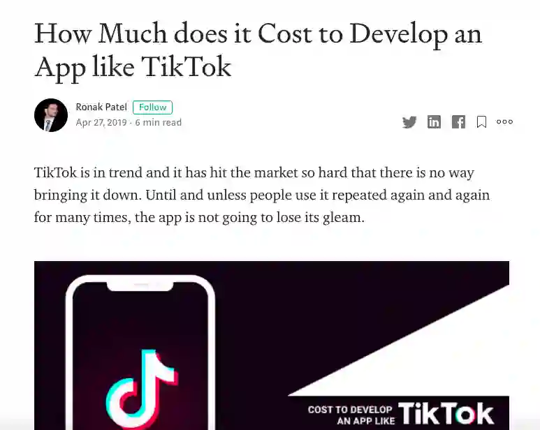 在国外热门的内容平台 Medium 上,一位开发者写了篇题为《How Much does it Cost to Develop an App like TikTok》的文章,从必备功能、技术能力需求、研发团队要求到实际开发成本等多个维度,对开发一款像 TikTok 这样的 App 的成本究竟有多少进行了仔细的盘算。
