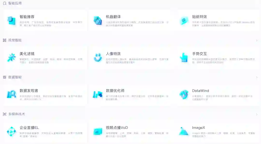 二、火山引擎的产品线很丰富,覆盖了视觉智能、数据智能、多媒体技术、智能推荐等多个方向,未来我们还会有更多技术产品和解决方案推出。这些产品,能够在各个业务场景上支撑企业的全面增长。