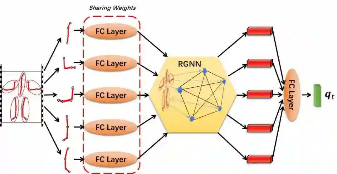 在空间上,该模型将人体结构划分为多个身体部位,如:头、手臂、躯干、腿等结构,并提出利用一个残差图神经网络(residual graph neural network(RGNN))去建模各个身体部位之间的人体结构特征。具体流程如图2所示:
