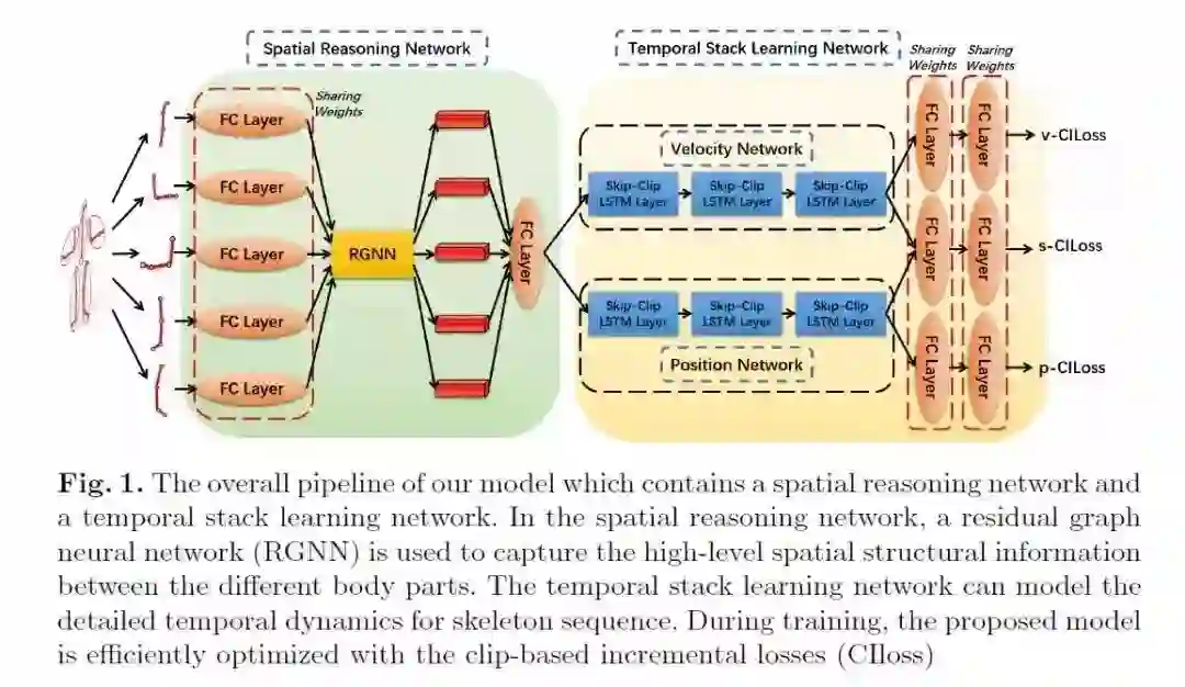 针对上述这两个问题,自动化所模式识别实验室提出Skeleton-Based Action Recognition with Spatial Reasoning and Temporal Stack Learning [5]