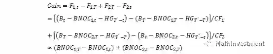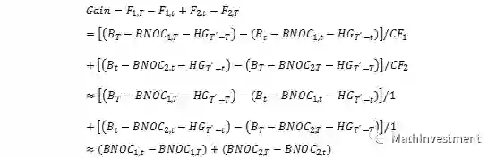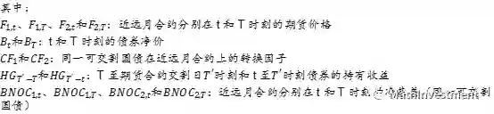 当t时刻发现近月合约被低估,远月合约被高估时,我们可以买入近月合约F(1,t),卖出远月合约F(2,t)。到T时刻,近远月合约价差变大,选择双向平仓而获利。关注私募工场ID:simugongchang,加私募工场老板娘微信guo5_guoguo。我们选择一可交割券,其在近月合约上的转换因子为CF1,在远月合约上的转换因子为CF2,那么整个套利过程的收益: