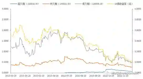 当收益率处于较高水平时,高久期国债为CTD券,但随着收益率的下行,在合约到期日,CTD发生切换的概率会越来越大,其转换期权的价值也会越来越高,例如T1512的高久期可交割券150016.IB,其转换期权的价值随着收益率的下行而上升。