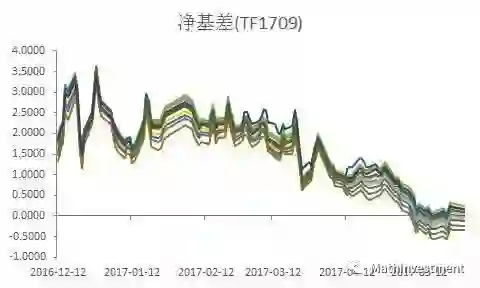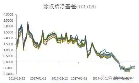 从TF1709合约来看,其可交割券的净基差走势虽然一致,但是它们的数值差别较大,每日最大值与最小值之差的均值为0.5666,每日各可交割券净基差一阶中心矩的均值为0.1312;可交割券的“除权后净基差”则更显集中,每日最大值与最小值之差的均值为0.3717,每日各可交割券“除权后净基差”一阶中心矩的均值仅为0.0865。