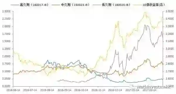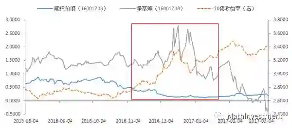 以T1703合约的高久期可交割券160017.IB为例,在2016年10月-12月期间,收益率逐渐上行,160020.IB的转换期权价值慢慢变小,但市场情绪较差,现货强于期货,“除权后净基差”呈现上升趋势。由于市场情绪对净基差的影响较转换期权价值大,净基差呈现上行的走势。