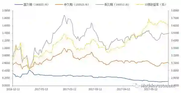 第一、将国债期货每日涨跌幅度换算成相应的收益率变化幅度,举例来说,T合约在2017/5/31上涨0.47%,CTD券170010.IB的修正久期为8.2858,则合约对应收益率下行(0.47%/8.2858)*10000=5.63BP;