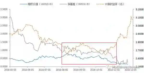 再比如,对于T1612合约的高久期券160010.IB来说,当收益率低于3%时,其转换期权价值较大。从具体时间段来说,在2016/7/20-2016/11/10期间,十年期国债收益率处于2.8%下方,160010.IB的转换期权价值均值为0.5442,净基差均值为0.9577,转换期权价值占比56.82%,两者走势高度相关。
