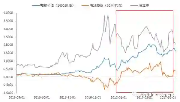 “除权后净基差”基于市场情绪的策略执行区间是2016/6/24-2017/3/10,总计173个交易日,累计收益率3.95%。从策略的结果表现来看,该策略在前期“牛皮市”中表现一般,但在后期,策略净值随着“除权后净基差”的大幅波动而上升,说明其很好地抓住了“除权后净基差”的趋势性变化,即期现货相对强弱的趋势性变化与“除权后净基差”的趋势性变化是一致的。