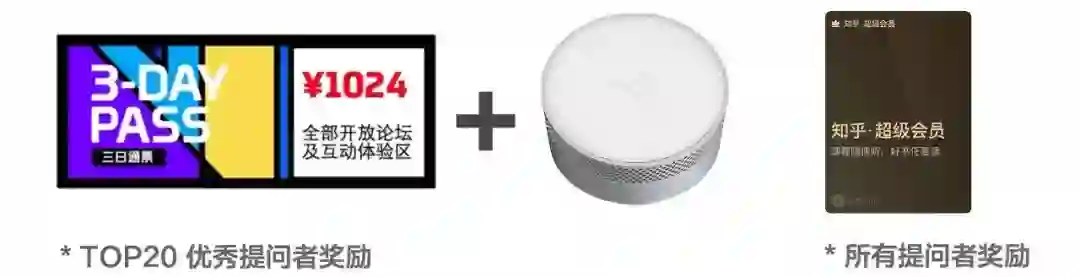 参与活动的每位提问者可领取知乎超级会员 5 天体验卡,其中最优质的 20 个问题提出者可获得价值 1024 元的极客公园创新大会通票 + 价值 499 元的小鸟音响 CAN 智能音乐小罐头,并有机会得到大咖的回答。