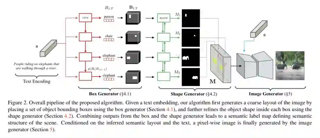 本文是密歇根大学和 Google Brain 发表于 CVPR 2018 的工作,论文首先从文字用一个 box generator 预测出物体类别所在的 bounding box 的位置,然后用 shape generator 在 box 的基础上生成更细腻的 mask,最后把 mask 和文字信息输送到 image generator 进行图片的生成。