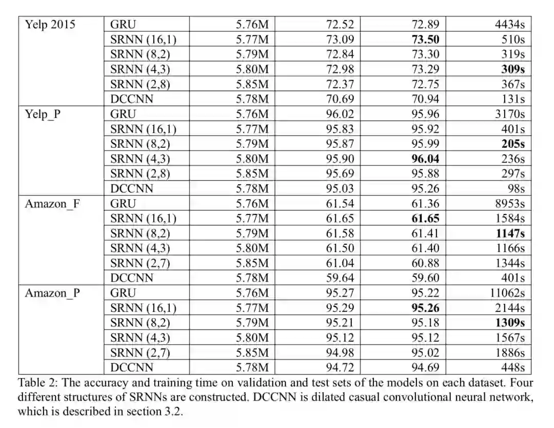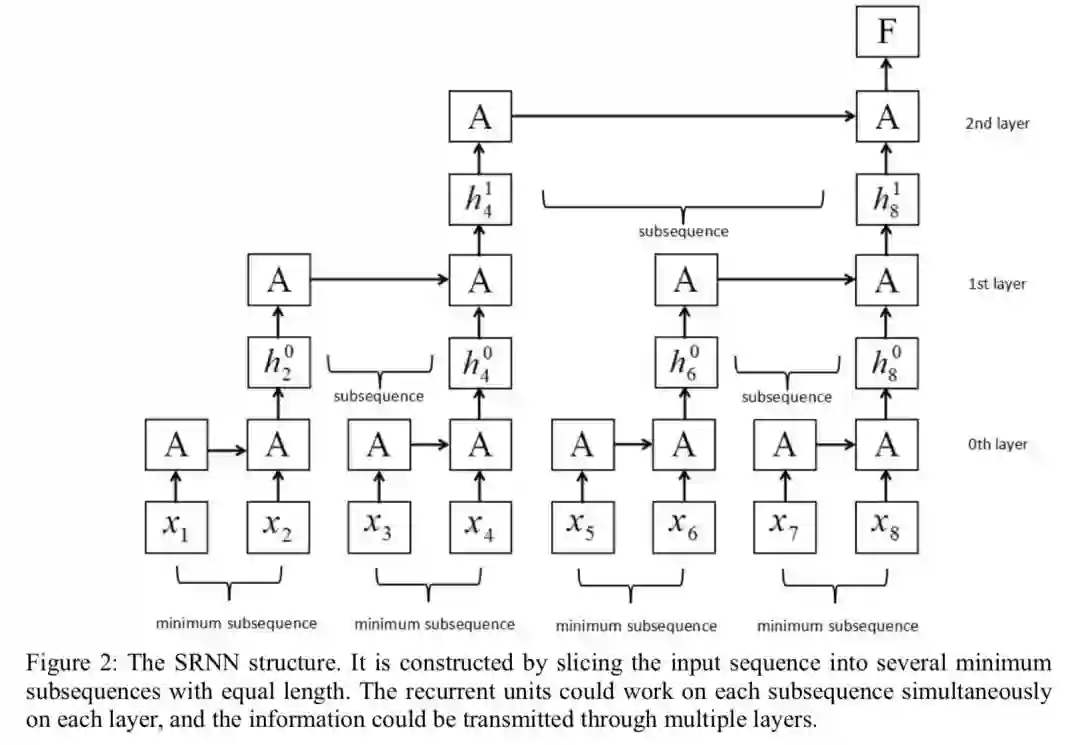 SRNN 把 RNN 序列分成每份 K 份,这样每份可以各自运行(并行),得到长度为 N 的新序列,后续可以新序列上继续如上操作,一直到序列长度等于 1 或满足需求。通过在 6 个较大规模的情感分类数据集上测试,相比于 RNN,SRNN 都取得很大的性能优势。