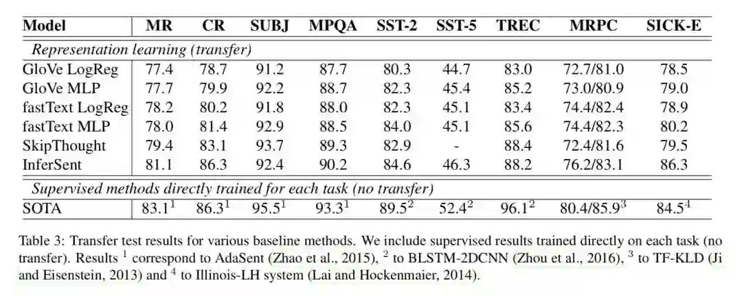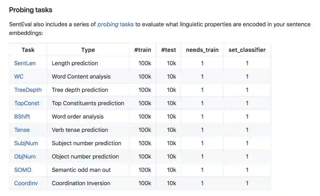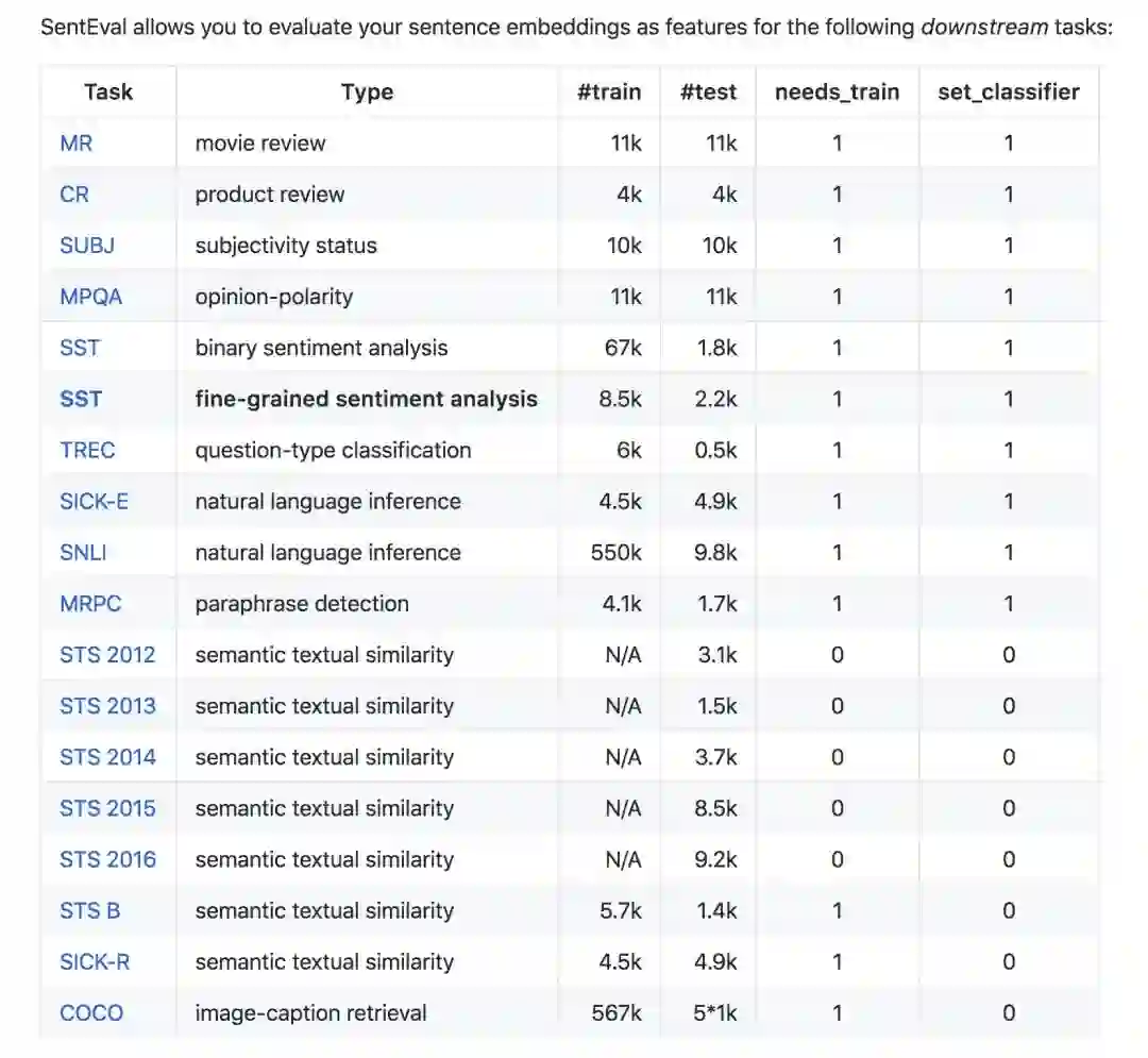 SentEval 是 Facebook AI Research 推出的一个用于测评 Sentence representation model 性能的 framework。其中自定义了至少 13 个任务(后续有添加),任务数据包括了文本文类,文本相似性检测,NLI,图片摘要的任务。其着眼点是目前 NLP 领域内不同模型的跑分不能很好的进行复现,进而导致横向比较模型性能比较困难的痛点。