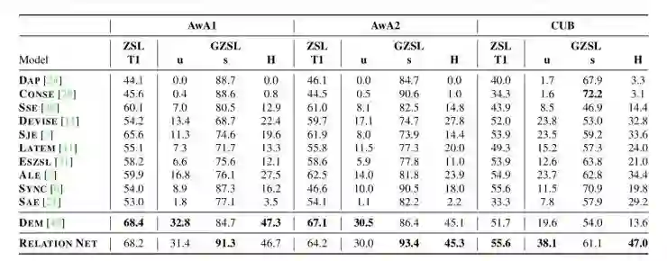 只做少样本学习不是这个模型的全部,我们很容易地把它做一些改变,就能直接用于零样本学习。零样本学习和少样本学习不一样的地方在于零样本学习不给样本,而是给出一个代表某一类物体语义的嵌入向量,我们要直接利用这个嵌入向量来对物体做分类。那么,在我们的关系网络中,我们只需要把训练样本(support set)改成这个语义嵌入向量就可以来做零样本学习了。