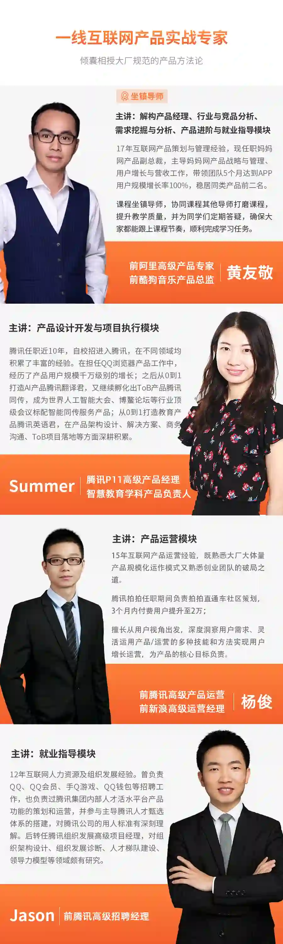 课程包含6大产品板块,围绕产品经理从0到1的工作流程展开,通过对竞品、需求、产品设计、项目管理、产品运营等知识的讲授以及各类代表性案例的深度拆解,构建全面的产品知识体系,培养产品思维与认知,最终达到大厂产品岗招人标准!