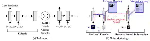 我们可以看到,网络的输入把上一次的y label也作为输入,并且添加了external memory存储上一次的x输入,这使得下一次输入后进行反向传播时,可以让y label和x建立联系,使得之后的x能够通过外部记忆获取相关图像进行比对来实现更好的预测。