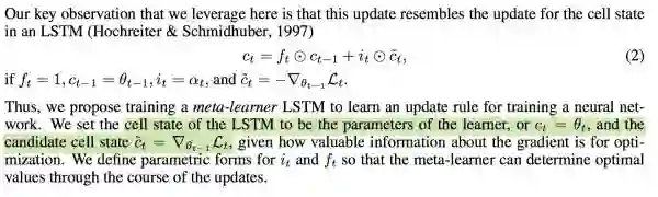 基本思路:LSTM内部的更新非常类似于梯度下降的更新,那么,能否利用LSTM的结构训练出一个神经网络的更新机制,输入当前网络参数,直接输出新的更新参数?这个想法非常巧妙。