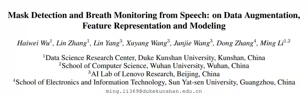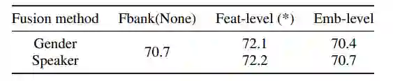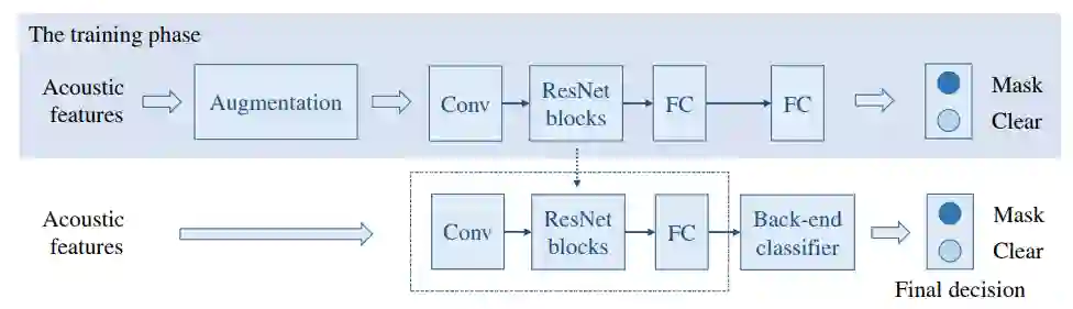 对于口罩检测任务,研究人员实现了两种卷积神经网络系统,即ResNet和DenseNet,以提取高级嵌入,然后在这些嵌入上采用SVM进行决策。研究人员还利用三种数据增强方法,这些方法在端到端框架中实现了重大改进。受到在情感识别方面的工作的启发,研究人员从基于ResNet的预训练性别分类器中自动提取了性别相关特征。这些特征来自使用Voxceleb1数据集训练的性别分类器网络的倒数第二个线性层。ResNet结构几乎与论文《On-the-fly data loader and utterance-level aggregation for speaker and language recognition》中描述的相同,不同之处在于倒数第二线性层的输出节点数为100。为了引入说话者的信息,研究人员按照上述论文的配置训练模型并提取嵌入作为说话者相关特征。在口罩检测器的优化过程中,这两种特征会在不同级别上融合。表1展示了性别特征融合方法与说话者特征融合方法对口罩检测的贡献。融合了这两种特征的口罩检测性能要比其他特征好得多,这表明这两种信息对于口罩检测都是有效的。也就是说,戴口罩可能给说话者语音的性别特征和身份特征带来较大的影响。表1:开发集上利用融合性别和说话者特征的口罩检测UAR(%,未加权平均召回率)。在表2中可以看到,与基于DenseNet的系统相比,基于ResNet的系统实现了更好的性能。三种数据增强方法均有助于显著提高性能。与对开发集进行随机擦除相比,SpecAugment方法可实现更大的性能提高。将SpecAugment和随机擦除相结合没有带来改进,这意味着SpecAugment和随机擦除的效果不是互补的。该团队最终提交的系统是将表1和2中标有(*)的系统融合在一起得到的,其性能大大优于测试集上的基准系统。 表2:开发集和测试集上的UAR。 3 模型和方法