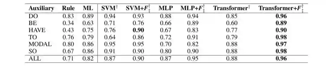 表 3. 通过 5 折交叉验证获得的 VPE 检测的 F1 得分。Rule 和 ML 是基线。SVM,SVM + F,MLP,MLP + F,Transformer 和 Transformer+ F 是 VPE 检测的方法。 †和‡表示实验结果分别对 Rule,ML 的结果在统计上显著,p <0.05。粗体结果表示最佳性能。