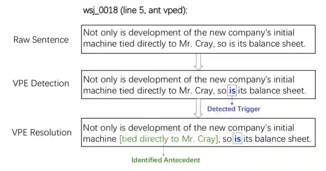 图 1. 一个动词短语省略恢复过程的例子,其中”is“是 VPE 的触发词,括号中的 VP “tied directly to Mr. Cray” 是 VPE 的先行短语。