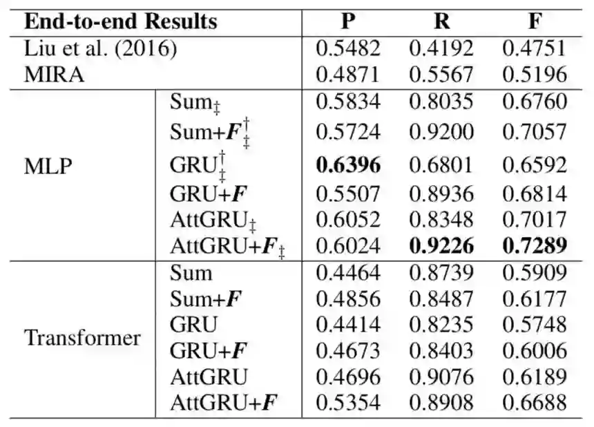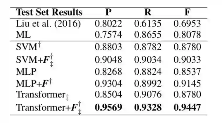 表 4. 使用 [3] 的训练和测试数据分割获得的 VPE 检测的精确率 (P),召回(R) 和 F1 分数 (F)。 †和‡表示结果在 Liu et al. (2016))[16] 和 ML[14]的基线上有显著性提升,p <0.05。 粗体结果表示最佳性能。