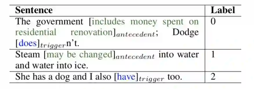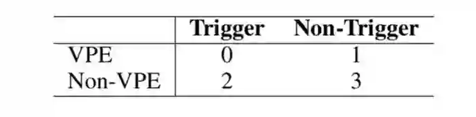 最近的动词短语省略恢复模型主要用于基准数据集 [3],其中每个句子都有一个先行短语和一个触发词。然而,考虑到探索更多的 VPE 现象,我们进一步扩展了四种情况下的数据,如表 7 所示。其中 0,1,2,3 分别表示具有触发词和 VPE 现象,没有触发词但具有 VPE 现象,有触发词但没有 VPE 现象,没有触发词和 VPE 现象。