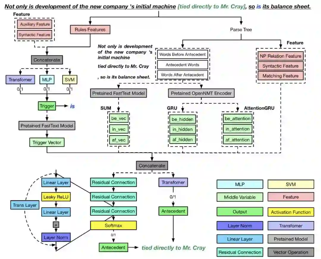 如图 2 所示,我们研究了一种端到端的学习框架将 VPE 检测和 VPE 消解整合到一起。对每个子任务,我们提供了可替换模型。例如,对于 VPE 检测,分类器可以是 SVM、MLP 或者 Transformer。对于 VPE 消解,模型可以是 MLP 或者 Transformer。