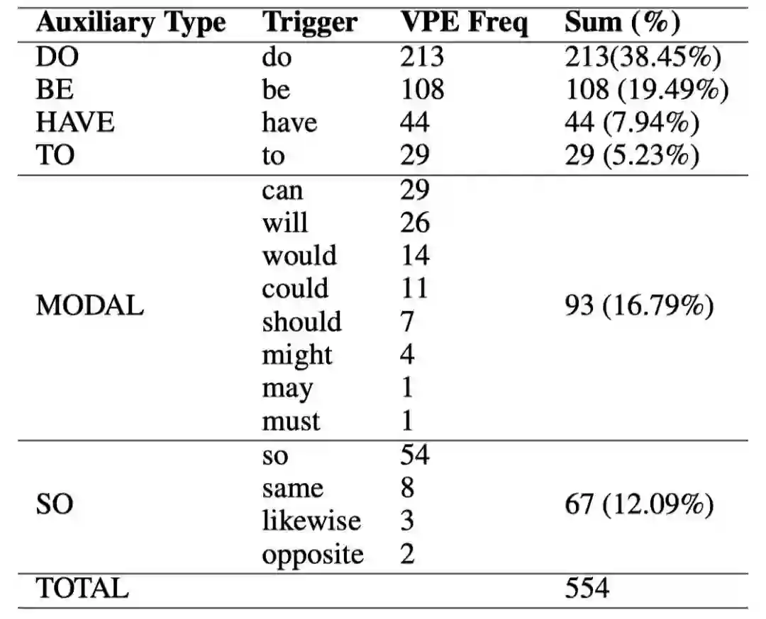 表 2. 实验数据集中助动词和相应触发词和 VPE 的统计。 Auxiliary, Trigger 和 VPE Freq 分别表示助动词类型,触发词和 VPE 频率