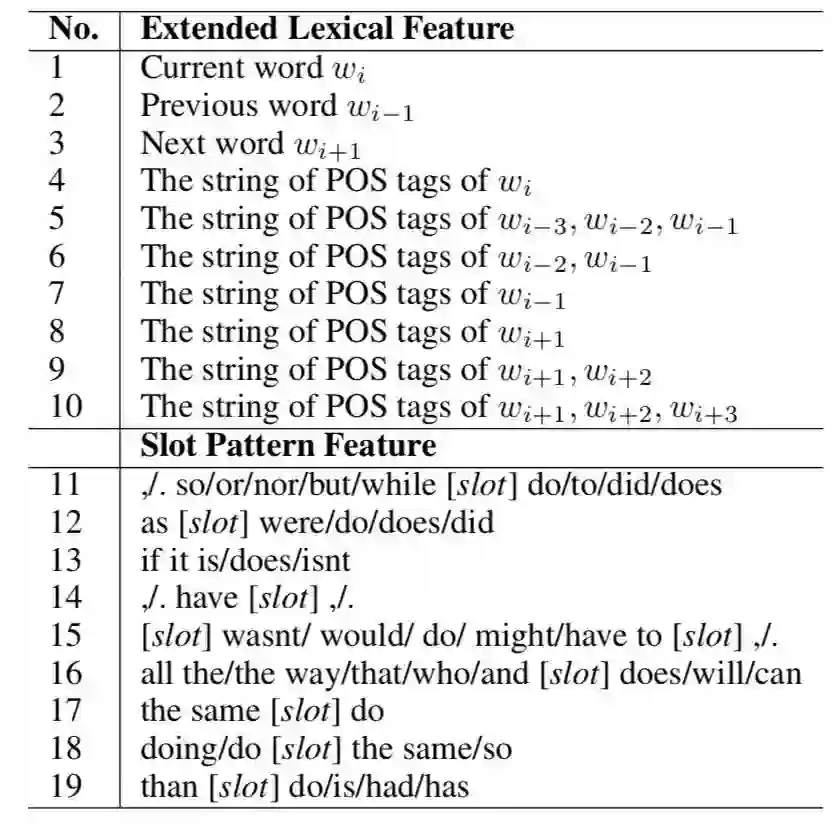 对于 VPE 检测,我们使用了 [14] 提出的特征,并且提出了一系列新特征。表 1 总结了从 [14]] 扩展的词法特征和槽模式特征。对于扩展的词法特征,我们的目标是捕获单词(No.1-3)和 POS 标签(No.4)的语义分布以及 POS 标签的顺序上下文信息(No.5-10)。对于槽模式特征,我们提出探索辅助相关的句法结构。 槽用来泛化匹配的范围。No.11-16 与助动词有关。No.17 和 18 是针对特定现象 “the same” 的参考,而 No.19 是针对 “comparative deletion” 的现象。[11]对这两种现象进行了探索。