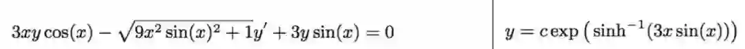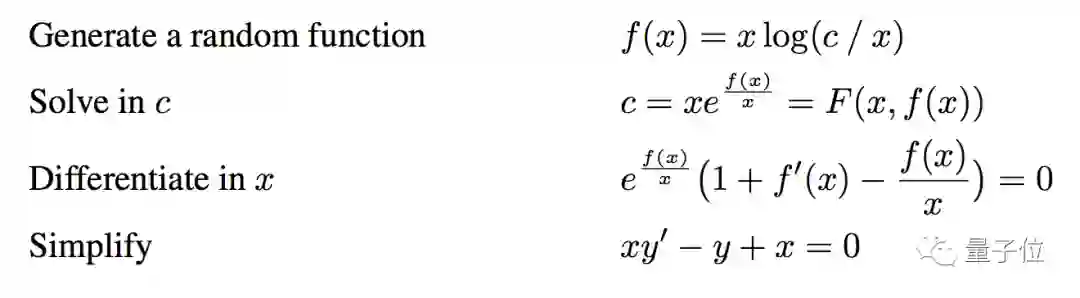 这样一来,想做出“一阶常微分方程&解”的成对数据集,只要生成一个f(x,c),对c有解的那种,再找出它满足的微分方程F就可以了,比如: