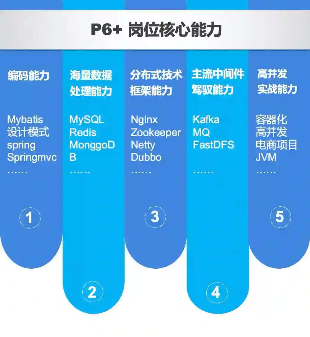 高级开发 / 架构师通常必须具备这 5 项能力 ——主流框架驾驭能力、源码阅读能力、高并发设计经验、架构设计能力、过硬的项目实战能力。