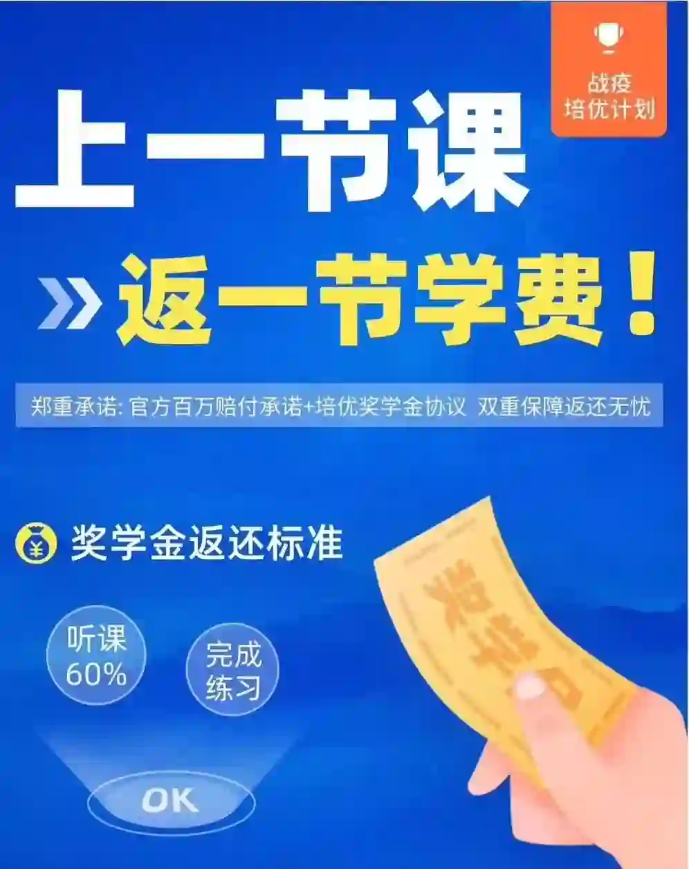 学员只要认真上课,每节课听课时长达到 60% 以上,并且提交课后作业(成绩不作为考核标准),即可获得当节课的学费返还奖励(按月度发放)。